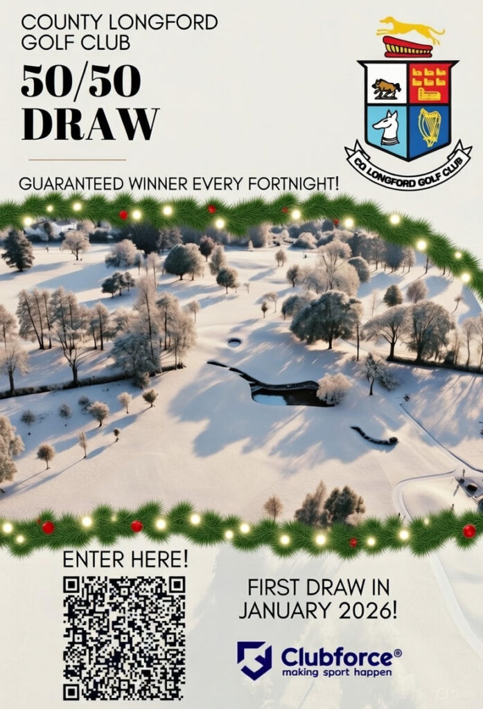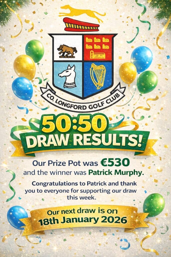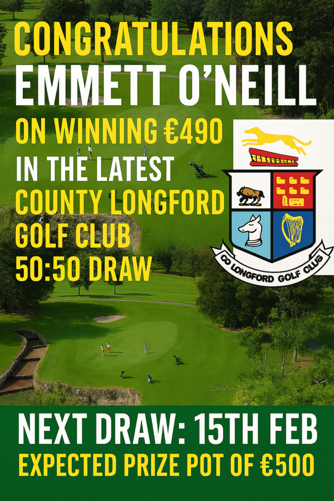 County Longford Golf Club’s 50/50 Lotto Draw lets members and friends win cash prizes while directly supporting course maintenance, facilities, and junior golf programmes.