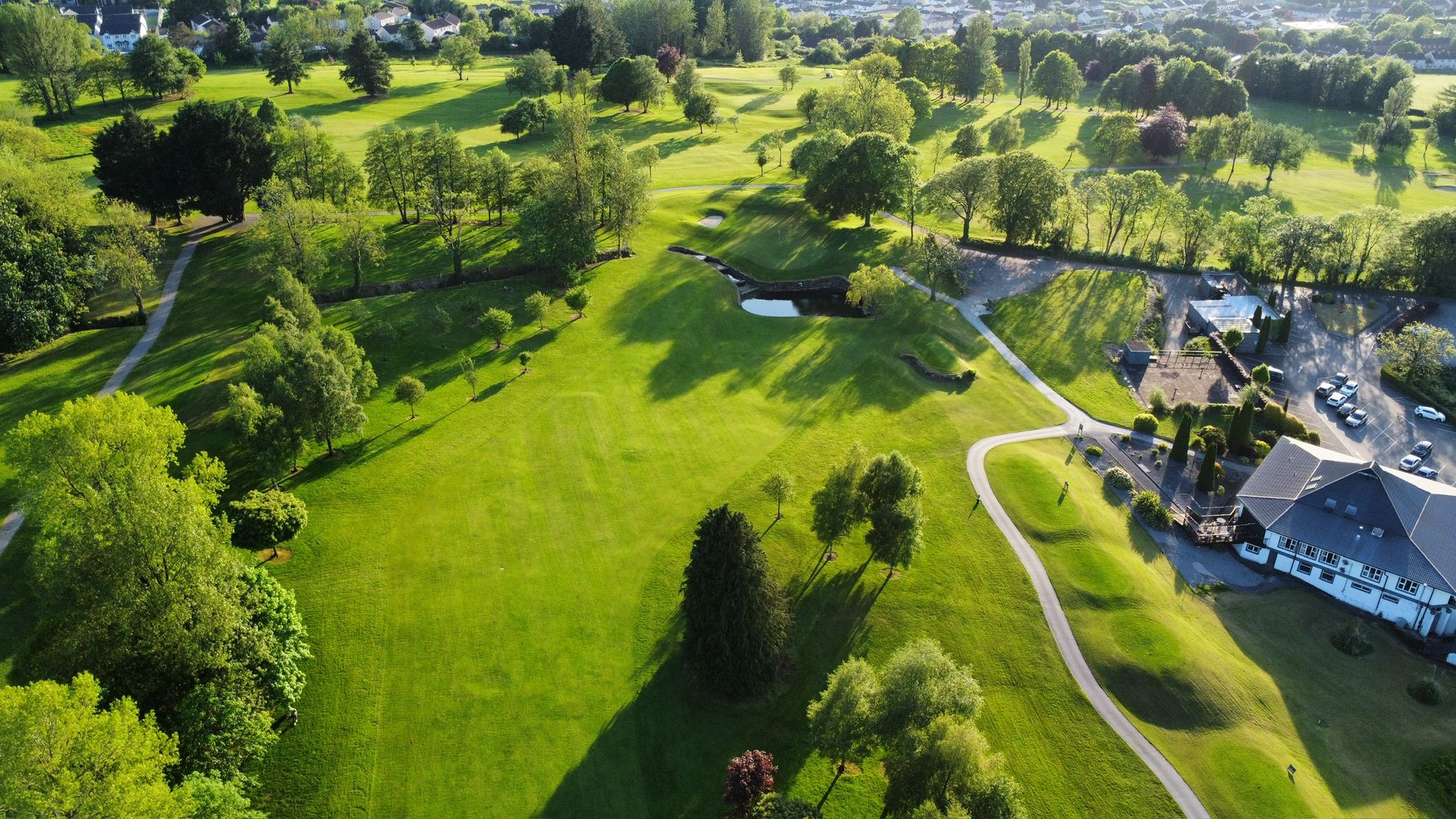 Par 5: Another of our signature holes. Drive centre of fairway. Keep your second shot left of large fir tree on right, leaving a daunting pitch over water to large receptive green. Beautiful finishing hole.